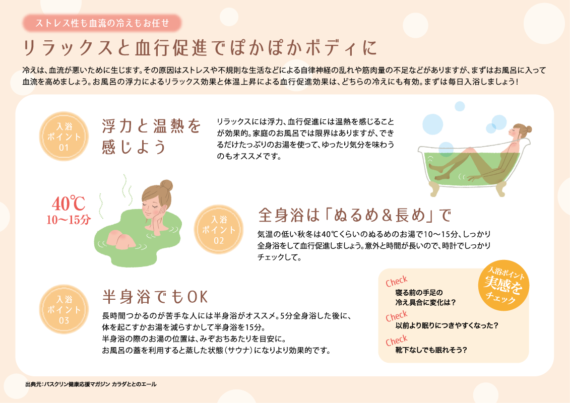 株式会社バスクリン様ご協力のもと「じっくりお風呂に浸かる入浴法」の提案セットです。