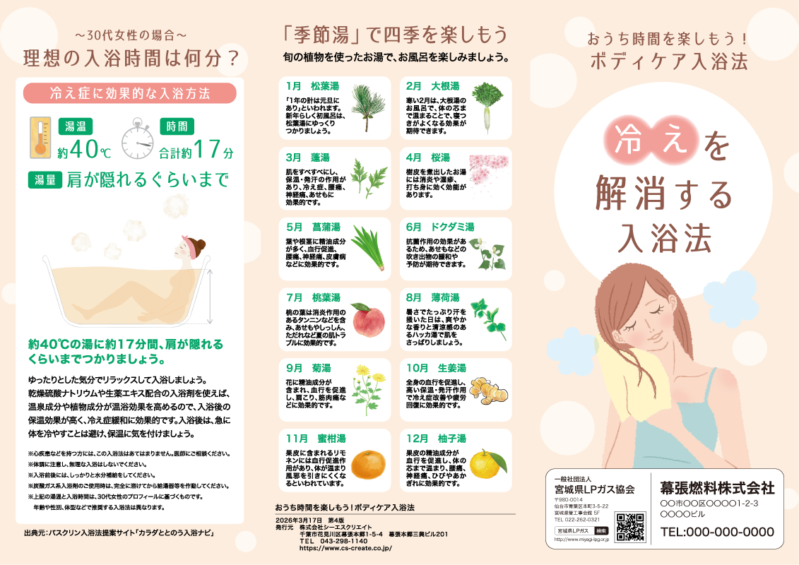 | 仕様 | 【セット内容】 ・入浴法提案リーフレット[冷え性対策] 1部 ・バスクリン「きき湯」 1袋(30g) |
