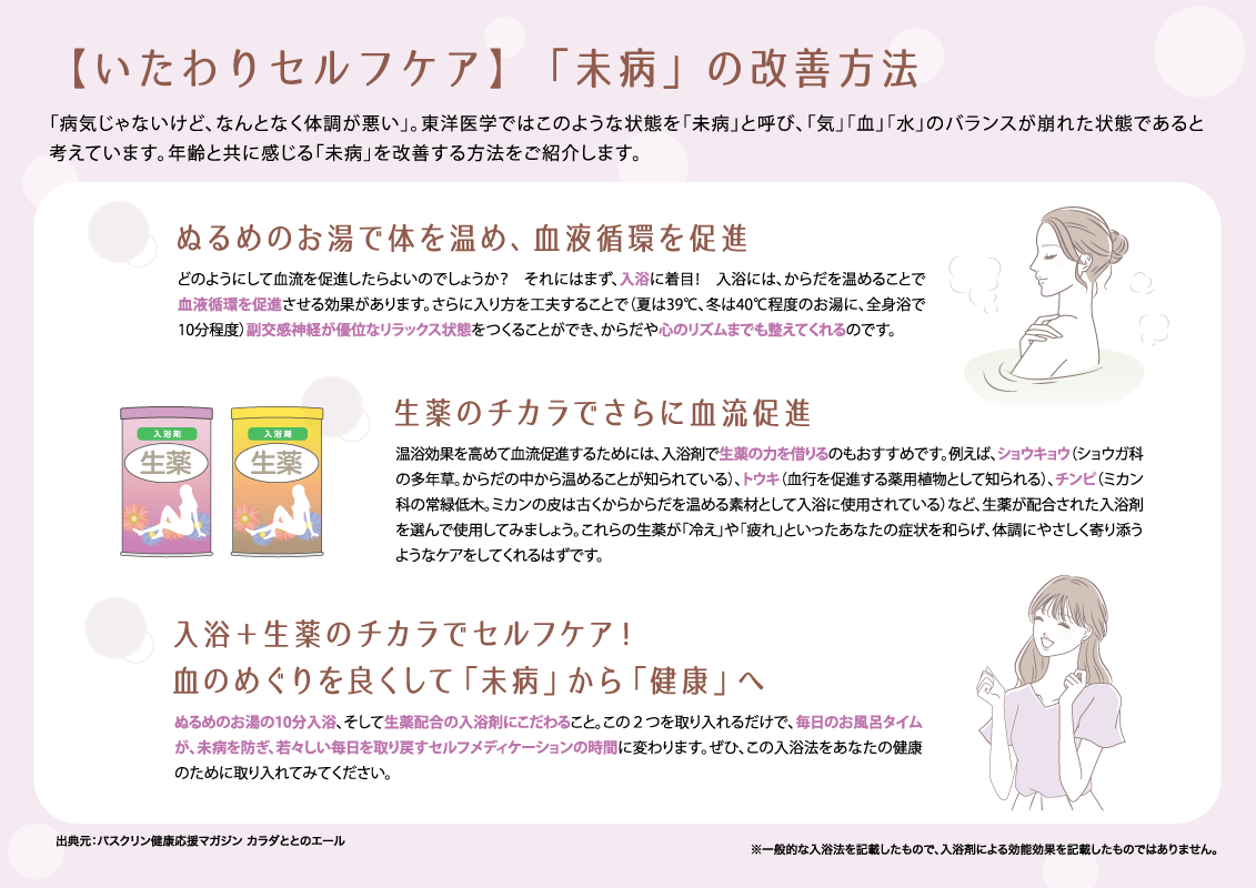 | 仕様 | 【セット内容】 ・入浴法提案リーフレット[未病の改善] 1部 ・バスクリン「きき湯」 1袋(30g) |