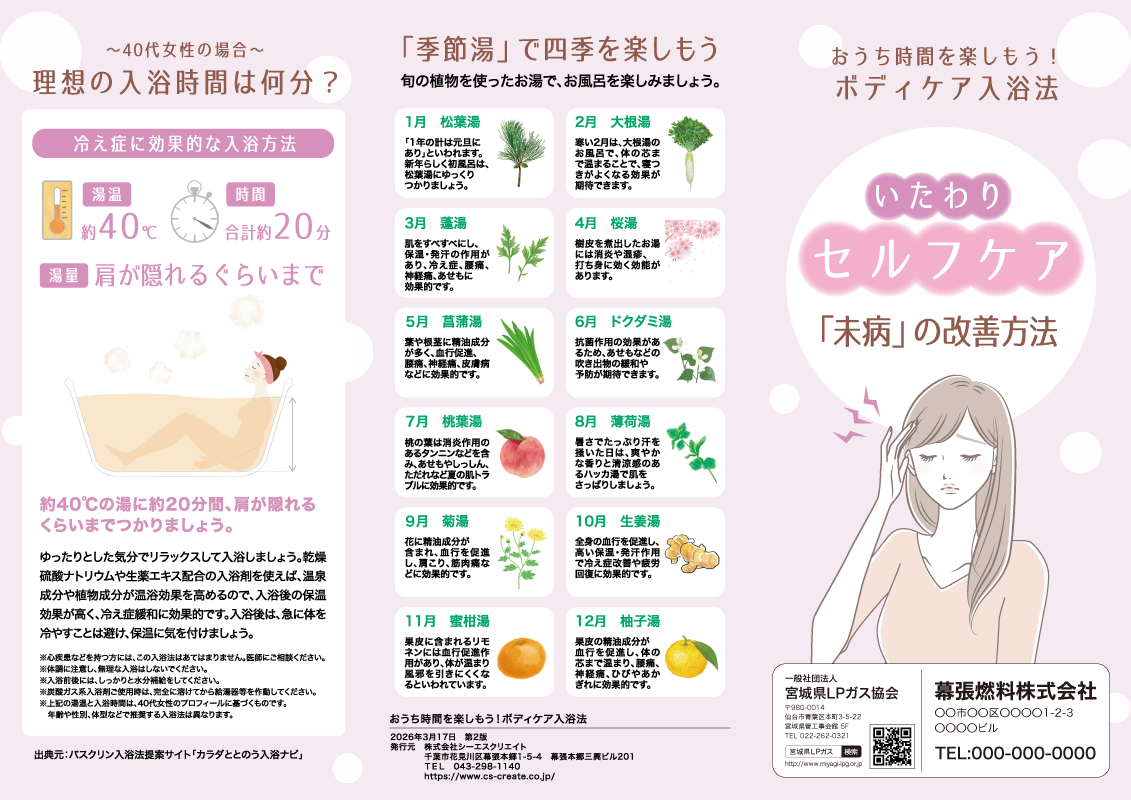 株式会社バスクリン様ご協力のもと「じっくりお風呂に浸かる入浴法」の提案セットです。お客様の健康増進を図り、快適バスタイムの創造の話題作りで、単位消費量向上の一助として是非ご活用下さい。